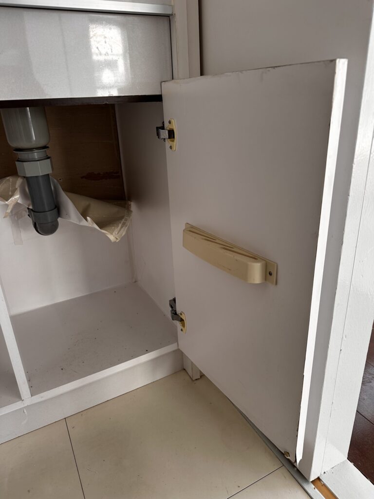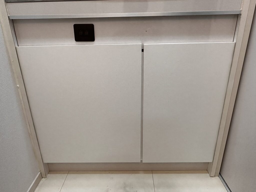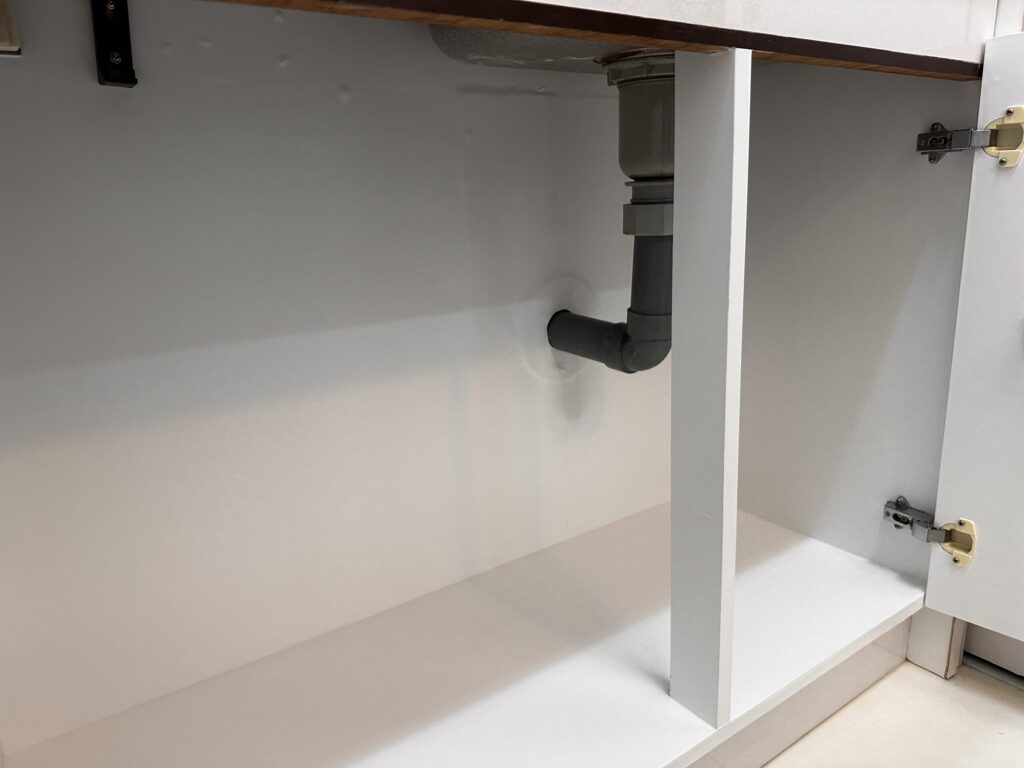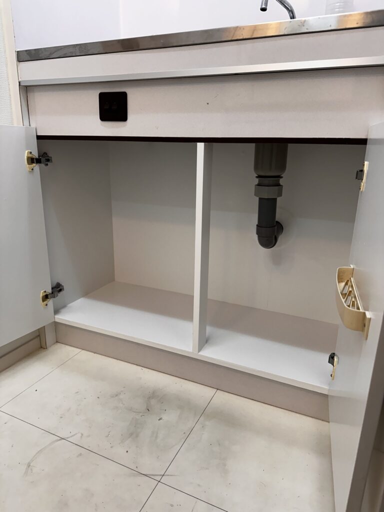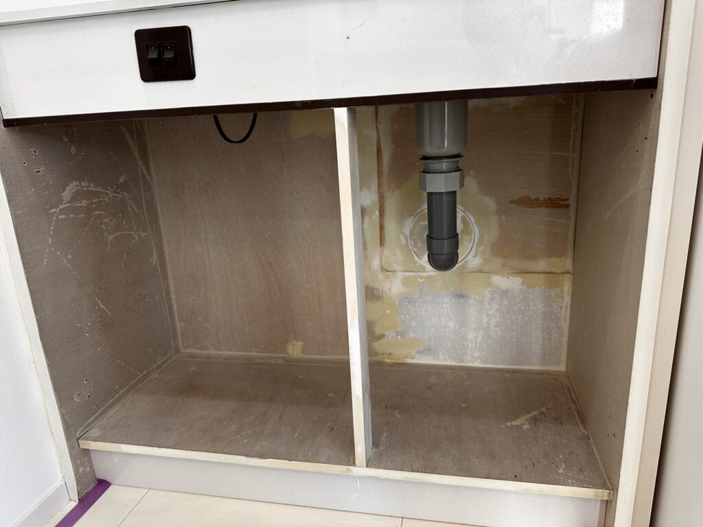 キッチンのシンク下の物入れが汚すぎるので塗装してほしい、とのご依頼。