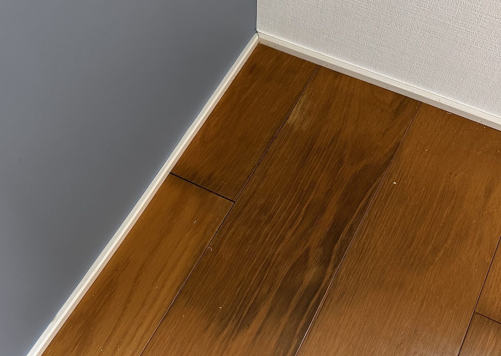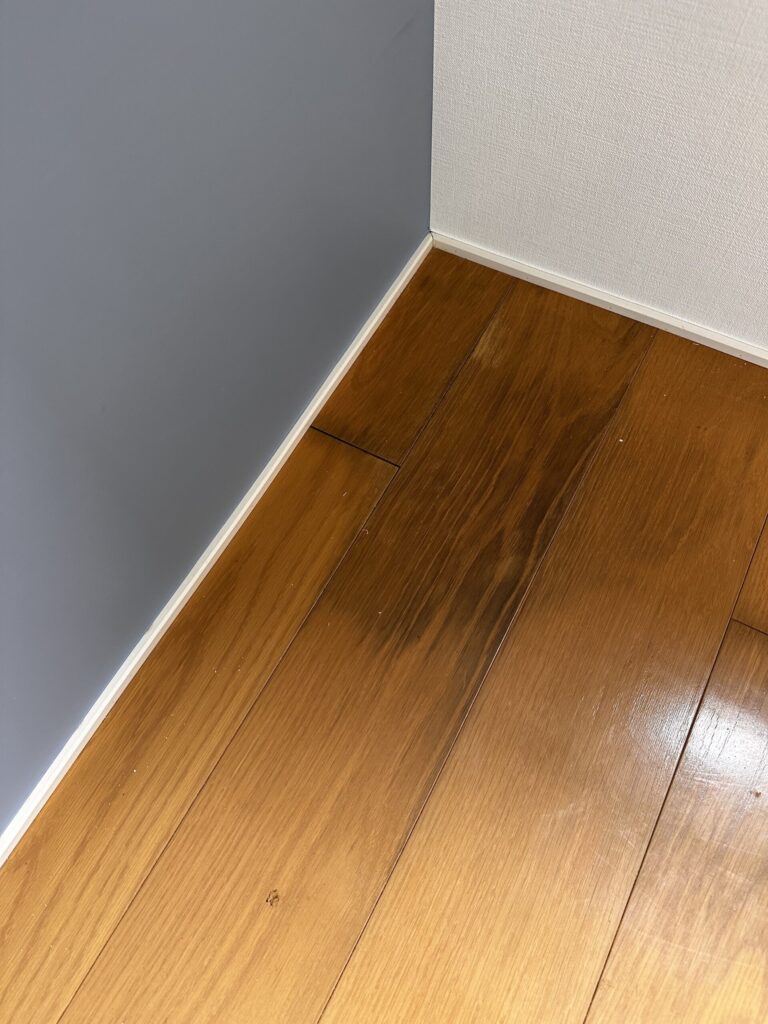 こちらの現場、エアコンから水が漏れてしまい、それを放置した結果、フローリングにシミができてしまったそうです。